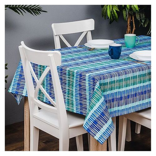 Nowoczesny obrus w turkusowo-niebieskiej kolorystyce z hydrofobową powłoką (utrudniającą plamienie).